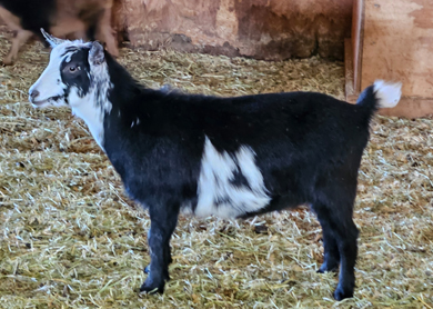 DOB: 1/8/2026 Doeling - Sells with ADGA registration app. Black & white. (Southern Grace Bayou Brigade *B x OldRuggedCross JF Phantom "Fanny") |
