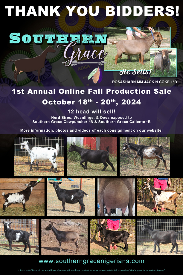 We would like to introduce you to our 1st annual Southern Grace Fall Production Sale! Our spring auction was so much fun, we decided to do it again! We are going to take a nod from our Western Performance Horse background, and try something that we hope will be fun, new and exciting for the dairy goat world!! We are so excited to offer you some outstanding goats from our program that you can take home and make you proud! To place a bid please text, email or send us a message on facebook! Bids must be in $25 increments and will be updated as we receive them. Photos and pedigrees listed below auction list. All goats must be picked up by October 27th unless other arrangements are made. Full payment is expected within 24 hours from the end of the auction, so must be paid before 7PM on Monday 10/21. All goats have a reserve, it will be noted if the reserve has been met. If the reserve has been met the goat will sell! Click on "SEE MORE DETAILS" to see more information, pedigrees, photos and a video of each consignment! All exposed does will sell with a completed online service memo. Some ADGA awards, such as +B, milk stars, *B, Champion designation, may be pending until ADGA catches up.